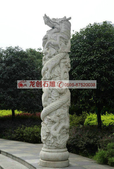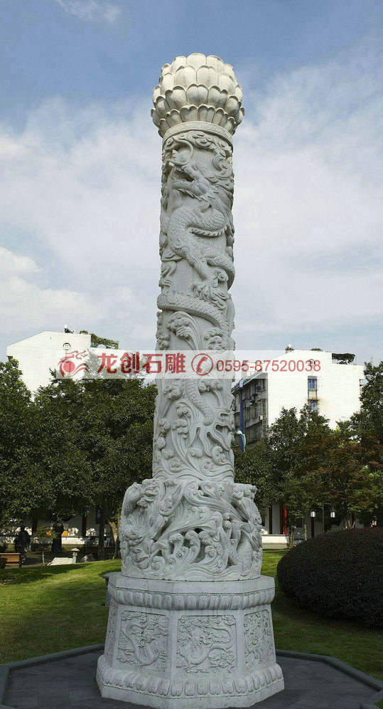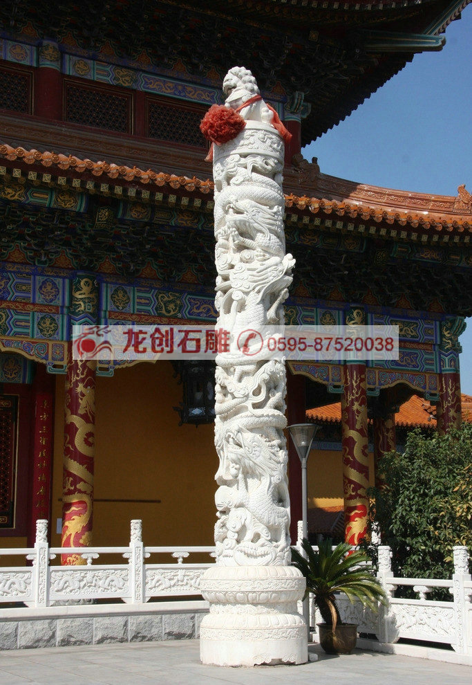 龍柱一般常見(jiàn)的都為石造浮雕華表,柱身圓形,雕有盤(pán)龍等紋飾,往往綜合運(yùn)用立體圓雕,透雕和里地引起的淺浮雕等技法于一體。柱頭和華麗的八角底座及四周石欄桿雕凸起蜿蜒之行龍與四個(gè)角柱上蹲獅組合,襯托出龍柱浮雕特具的素滌華貴之美。