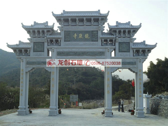 門樓牌坊雕刻的樣式,門樓牌坊設計時沒有樓的構造,既沒有斗拱和屋頂,而門樓牌坊設計時有斗拱和屋頂,它有更大的烘托氣氛。但是由于它們都是我國古代用于表彰、紀念、裝飾、標識的一種建筑物,而且多用于主要街道起點、交叉口、橋梁,古代多用于宮苑、寺觀、祠堂、衙署等處,景觀性很強,起到點題、框景、倩景等效果,長期以來老百姓對“坊”、“樓”的概念不清,所以到最后兩者成為一個互通的稱謂了。牌坊石雕、石雕牌坊、牌坊,現在很多石雕廠為了利益把石雕之本已經拋棄了,他們建造的門樓牌坊都是為了應時之景,雕刻工藝粗糙,已經徒有其表,門樓牌坊原本的神采和韻味乃至意義都不復存在。