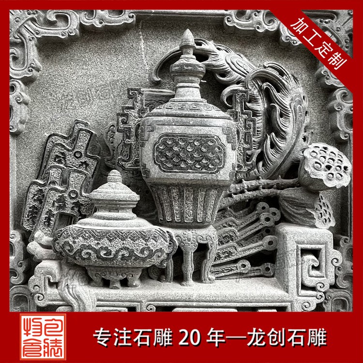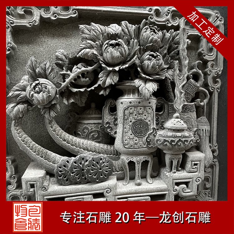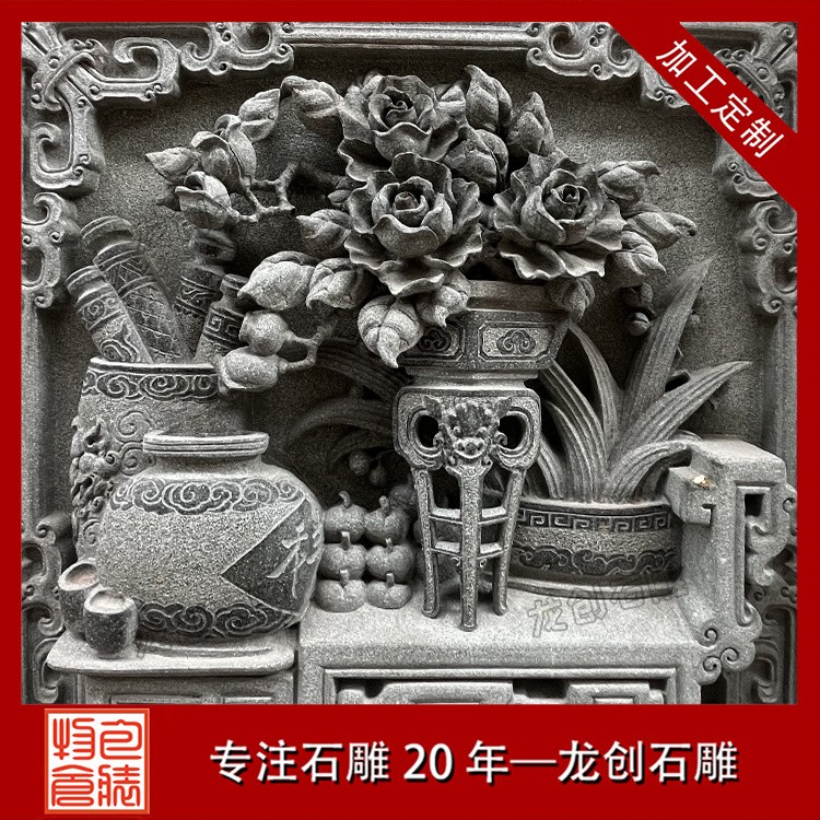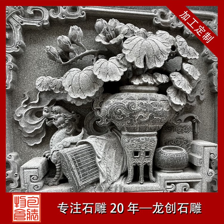 在工藝技法上,這類浮雕注重平面構圖向立體空間的轉換。采用寫實與寫意相結合的表現手法,花朵枝葉的形態力求準確,而整體布局則講究虛實相生。雕刻時通常分三個層次處理:遠景層淺刻勾勒,中景層適度凸起,近景層重點刻畫。特別是禽鳥的喙眼、花瓣的翻卷、葉片的脈絡等關鍵部位,通過精細的刀工呈現出生動的細節質感,使堅硬的青石呈現出柔美的自然氣息。