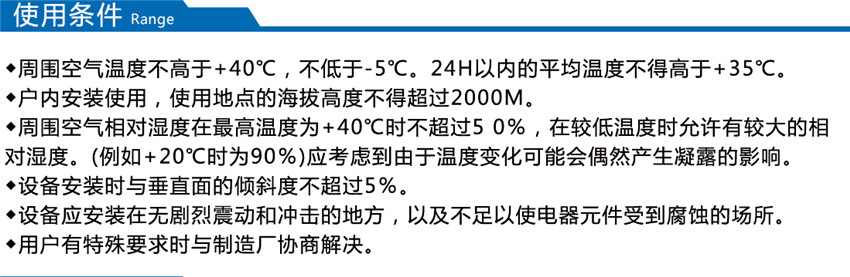 裝置適用于發(fā)電廠、石油、化工、冶金、紡織、高層建筑等低壓配電系統(tǒng)。海拔高度不超過(guò)1000m;周?chē)h(huán)境溫度-25℃ - +40℃;無(wú)導(dǎo)電性塵埃、腐蝕性氣體和水蒸氣的場(chǎng)所;無(wú)火災(zāi)和爆炸危險(xiǎn)的場(chǎng)所;無(wú)經(jīng)常性劇烈震動(dòng)場(chǎng)所。