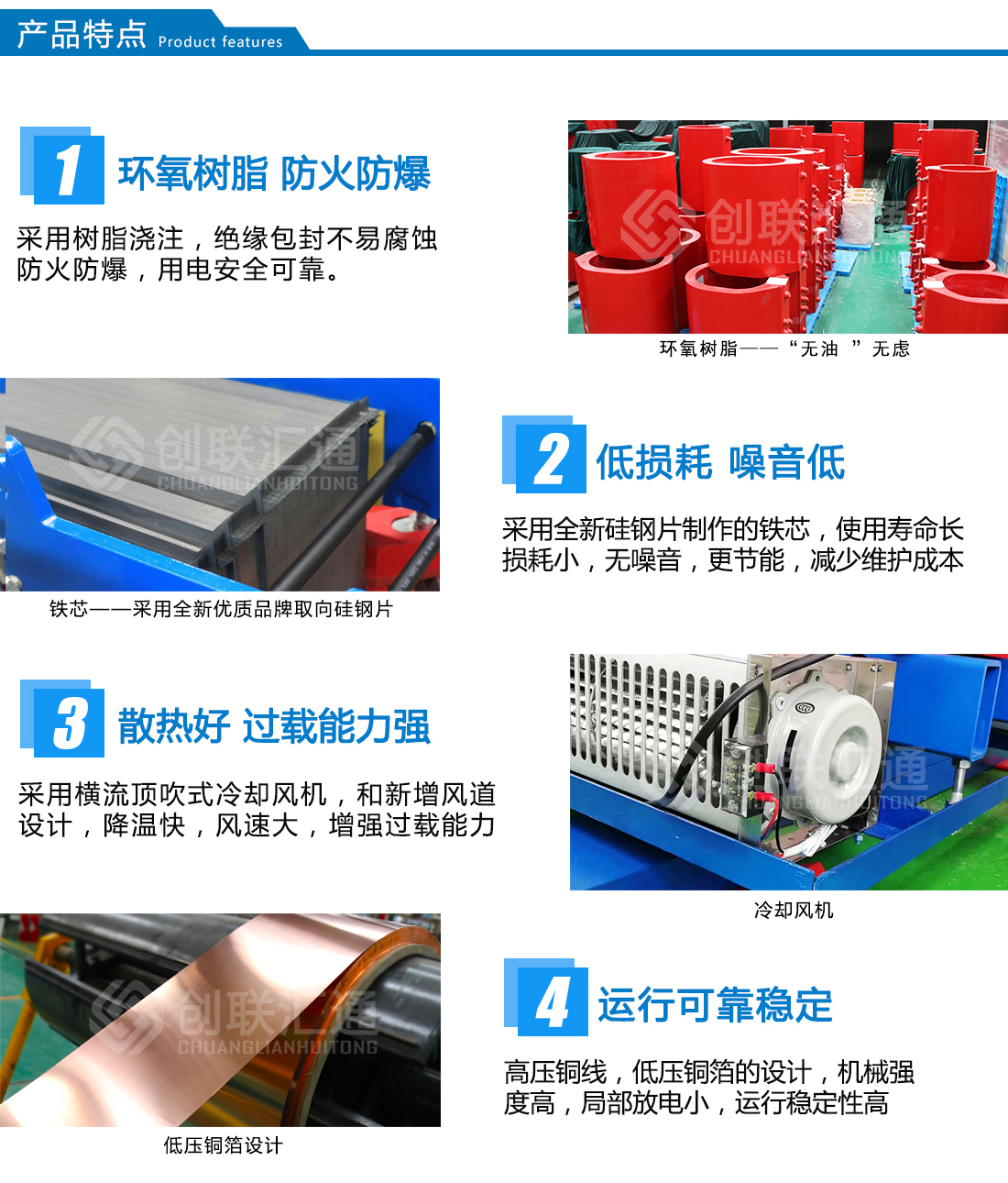 ⒊澆注式:用環氧樹脂或其它樹脂澆注作為主絕緣,它結構簡單、體積小,適用于較小容量的變壓器。