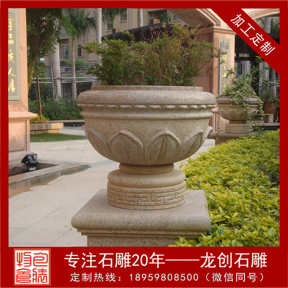 現代石材石雕花缽,是種花用的器皿,為口大底端小的倒圓臺或倒棱臺形狀。石雕花缽制作材料可以是花崗巖,砂巖,大理石,芝麻白,等。石雕花缽美麗的色澤還能保存百年以上,顏色美觀,格調高雅,花色繁多,剛性好,溫度變形小,保養方便簡單,使用壽命很長。