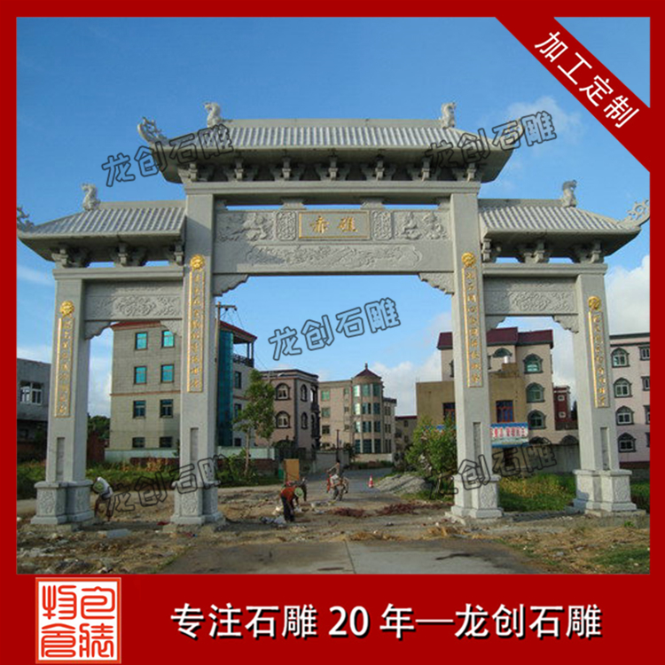 5、交通標志石雕牌坊,建在村莊路口交匯處的牌坊。其作用是標示所處交通路線、區位走向和關聯地區。