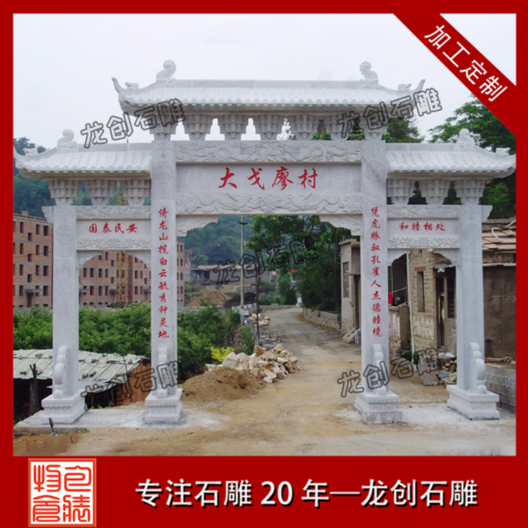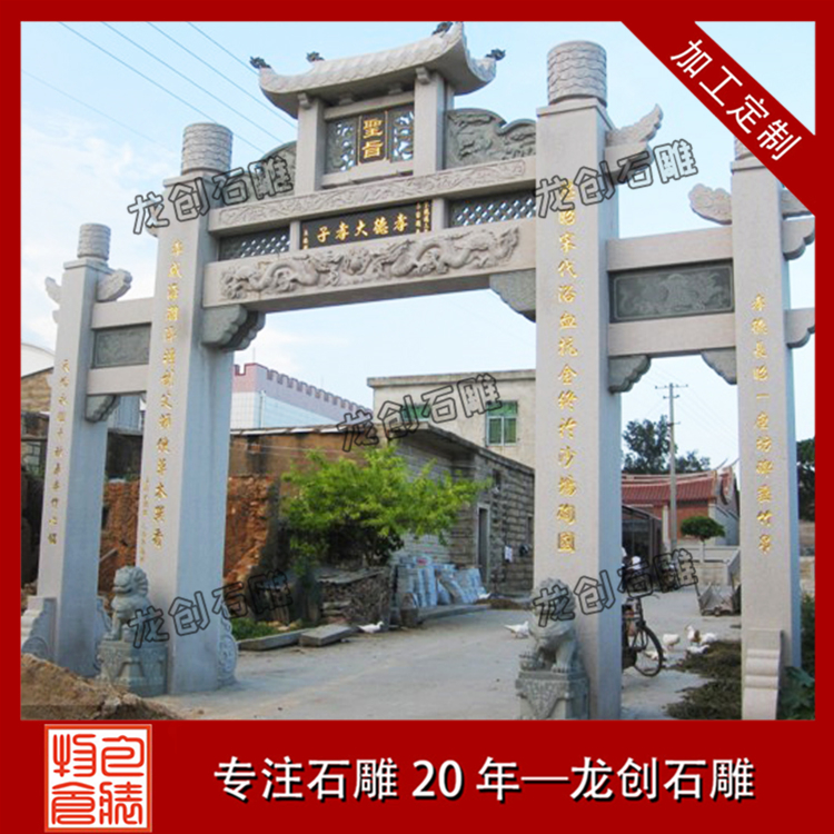 村口石牌坊定制加工浮雕有祥龍、麒麟、吉祥大象等,石獅子位置是石牌坊抱鼓石的位置,在石牌坊主體建筑門前人們不抬頭也可以一眼就看到,不僅很好地映襯和裝飾了進村牌坊主體建筑,而且更地塑造了整個村莊的吉祥文化氣氛。古人生活在一個易受自然災害侵襲和其他不確定因素侵犯的環境中,需要這種“進村石牌坊布局加以保護,進村牌坊雕刻具有寧靜、安詳的特點。進村牌坊上的守門石獅的設置正是對這一特征的強化,是古人追求平靜祥和這一心理特征的側面反映。