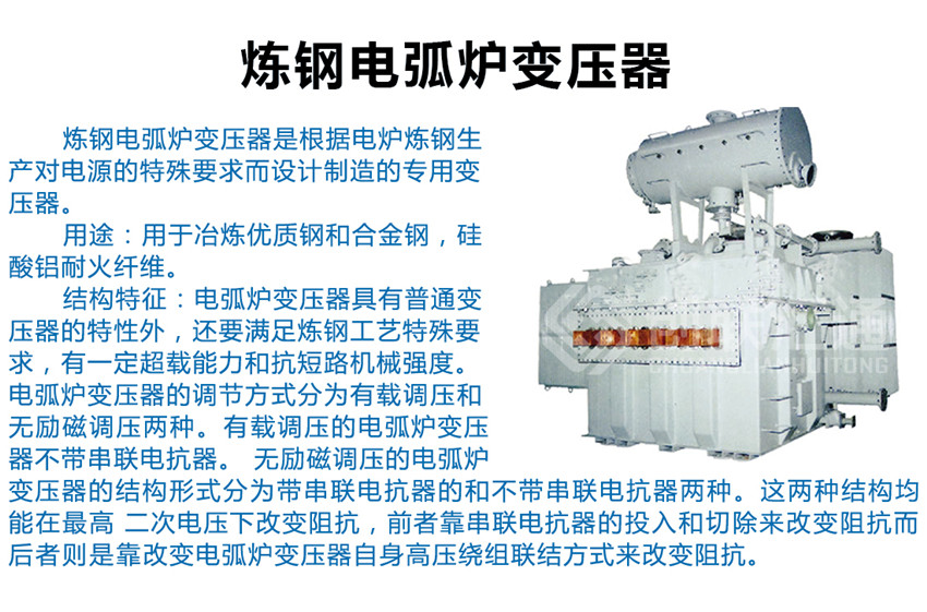 電弧爐變壓器具有普通變壓器的特性外,還要滿足煉鋼工藝特殊要求,有一定超載能力和抗短路機械強度。電弧爐變壓器的調節方式分為有載調壓無勵磁調壓兩種。有載調壓的電弧爐變壓器不帶串聯電抗器。 無勵磁調壓的電弧爐變壓器的結構形式分為帶串聯電抗器的和不帶串聯電抗器兩種。這兩種結構均能在高 二次電壓下改變阻抗,前者靠串聯電抗器的投入和切除來改變阻抗,而后者則是靠改變電弧爐變壓器自身高 壓繞組聯結方式來改變阻抗。