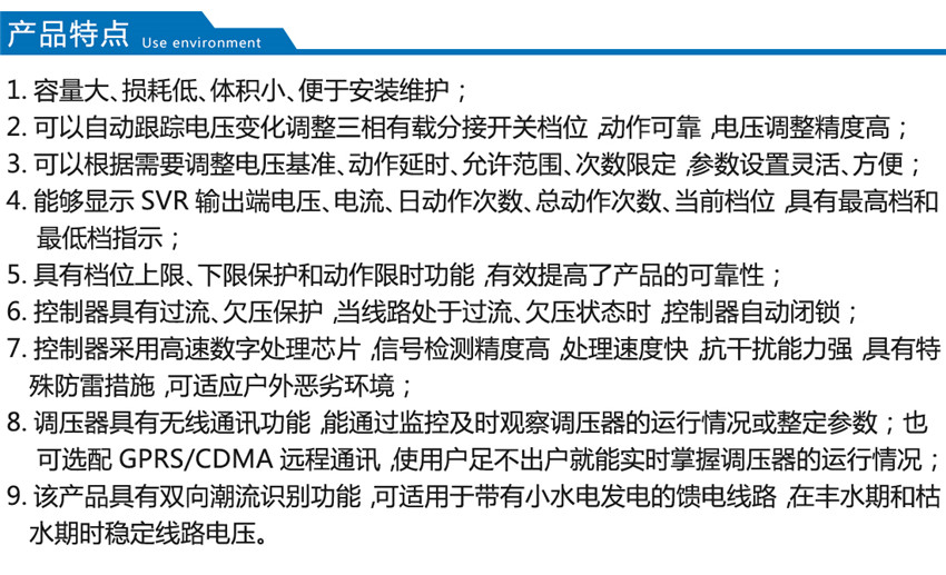我公司生產(chǎn)的SVR型線路自動(dòng)調(diào)壓變壓器原理是SVR與10kV 柱上無(wú)功自動(dòng)補(bǔ)償裝置GWJ配合使用,可有效地解決線路電壓低及無(wú)功電源不足的問(wèn)題。SVR 能有效地調(diào)節(jié)電路電壓, GWJ無(wú)功補(bǔ)償裝置能有效補(bǔ)償無(wú)功,提高功率因數(shù),降低線損,其效果相當(dāng)于一個(gè)簡(jiǎn)易的柱上變電站,而造價(jià)僅為常規(guī)變電站的1/6~1/10。而成本只有變電站的1/6,1/7,而且無(wú)需工作人員值班維護(hù)。
