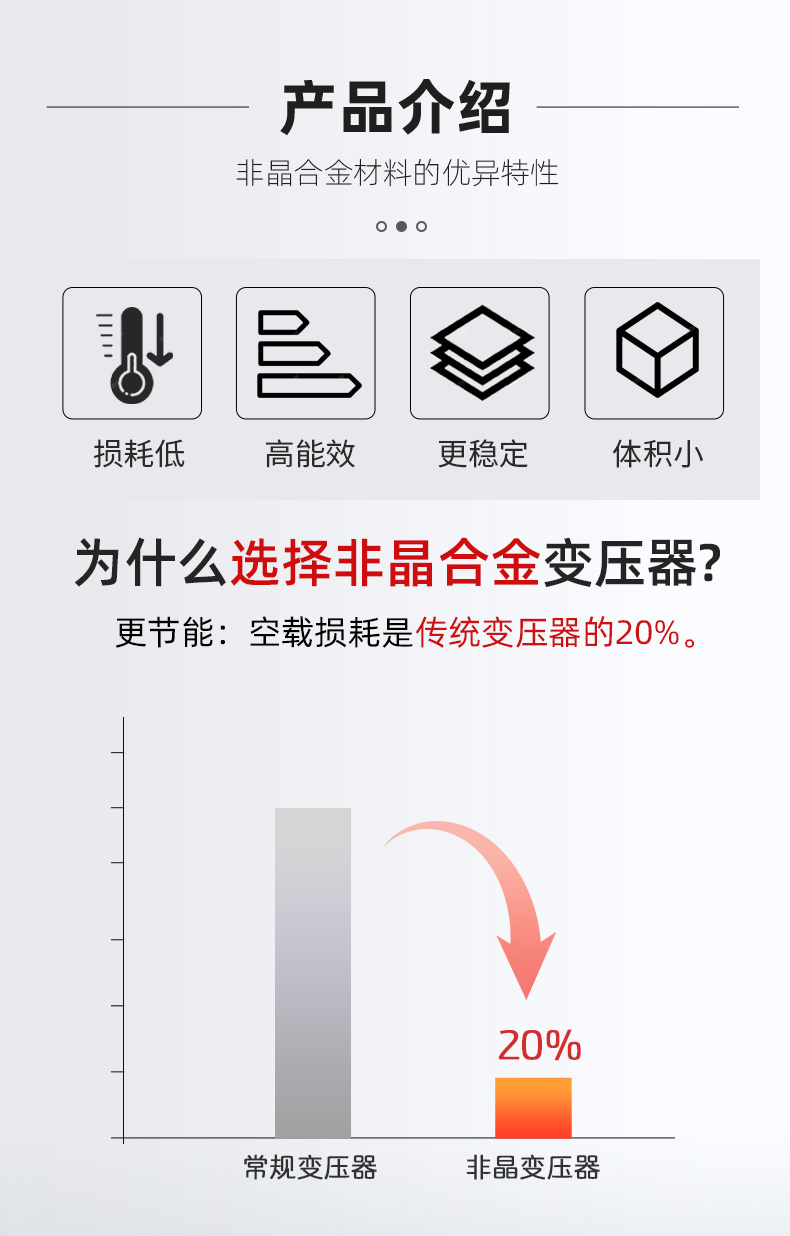 該變壓器的鐵芯采用非晶合金材料,相比傳統(tǒng)的硅鋼片材料,其磁導(dǎo)率高,鐵損耗低,磁飽和感低,從而使得變壓器的效率得到了進(jìn)一步提高。另外,非晶合金材料在加工時(shí)可以制成形狀各異的薄帶狀材料,鐵芯損耗低,結(jié)構(gòu)緊湊,提高了變壓器的功率密度,進(jìn)一步減小了變壓器的體積和重量。